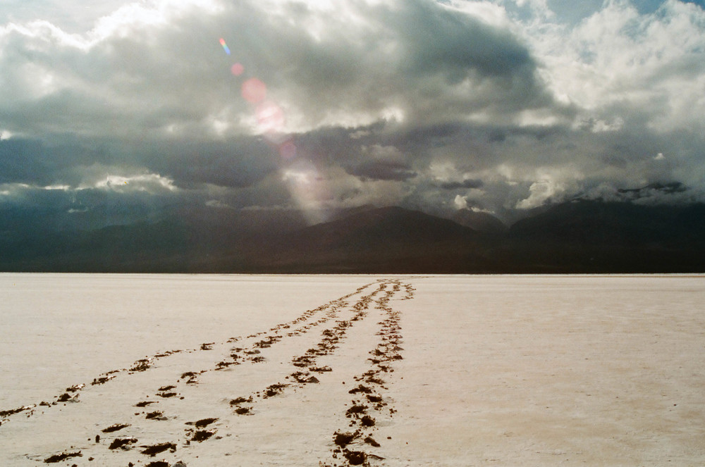 I turned around at one point and the sky was just breathtaking. I decided it was worth sinking a couple inches into the mud to get that shot. So I pulled out my camera and snapped a few pictures. One, in particular, is my favorite. You can see all our sets of footprints in the mud beneath a sky peppered with rain clouds as you look back to the Panamint range. Satisfied, I put my camera back in my pack and began trudging again.